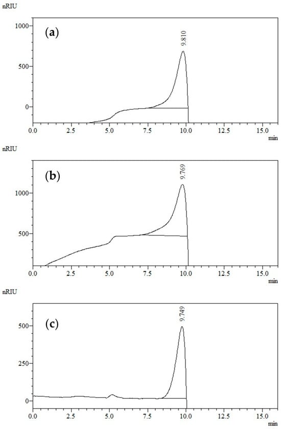 The molecular weight distribution pattern of the isolated polysaccharides is represented in Figure 1 below. It can be seen that the elution profile of conventionally extracted polysaccharide (Figure 1a) looked remarkably similar to that of the polysaccharide obtained by ultrasound-assisted water extraction (Figure 1b). The polysaccharides comprised low molecular weight populations having a molecular weight in the range of the inulin standard (DP 25) used (Figure 1c). The peaks were eluted (7.5–10 min) without a pronounced tailing implying that there was no heterogeneity within the samples. Bearing in mind the data for purity (Table 4) and the retention time, the corresponding peaks can be attributed largely to inulin fractions that occupied a very high percentage (100%) of the total peak area, and thus a higher part of the isolated polysaccharides.