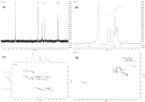 NMR spectrum of inulin polysaccharide isolated from echinacea root: (a) 13C spectrum; (b) 1H spectrum; (c) HMBC spectrum; (d) HSQC spectrum.