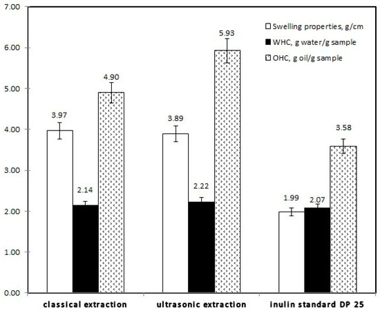 The results on functional properties (swelling properties, oil, and water-holding capacity) of the isolated inulins are shown in Figure 4. From the data in the graph, it is apparent that samples have better oil-holding capacity than water-holding capacity. In general, the inulin obtained by ultrasonic extraction was distinguished by the highest oil holding capacity (5.93 g oil/g sample), as well as with good swelling capacity–3.89 g/cm3. All inulins exhibited a similar water-holding capacity of about 2 g water/g sample.