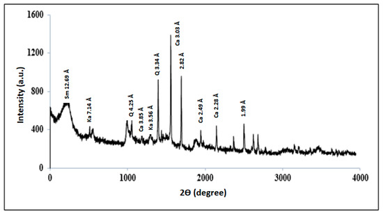 X-ray diffraction of clay suggests that it is a sodic smectite sample (2θ = 12.69 Å) associated with quartz (2θ = 20.89° and 26.65°), calcite phases (2θ = 23.10°, 26.65°, 36.02° and 39.45°) and kaolinite fraction (2θ = 12.38°, 24.96°) (Figure 4) [21].