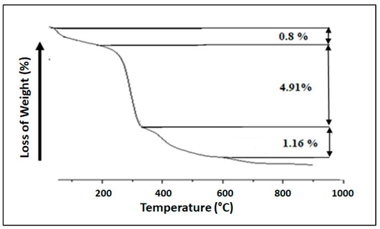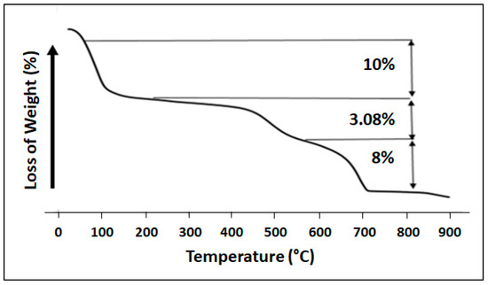 The thermal analysis curves of the clay, as shown in Figure 6, reveal three distinct reductions in mass. The initial mass reduction (10%), spanning from 323 K to 473 K, was linked to the removal of moisture and water from interlayers (as depicted in Figure 6). The subsequent mass decline (3.08%) occurred within the temperature range of 473 K to 873 K and was associated with the loss of structural water. The final loss mass (8%) was attributed to the decarbonization of clay.