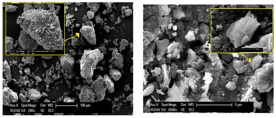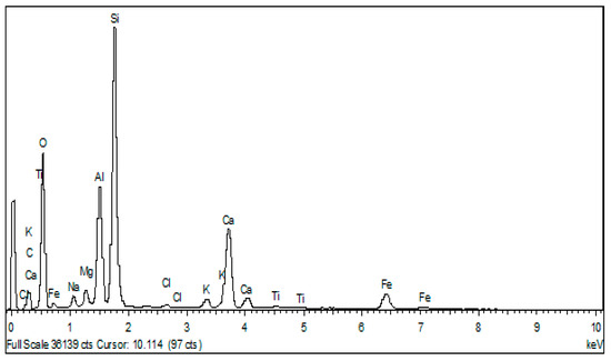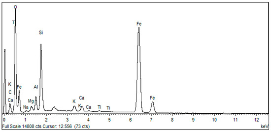 The SEM micrographs provide a broad overview of the surface morphology of the iron ore. The observations with a scanning electron microscope coupled to an EDX instrument (quantitative analysis), carried out on the iron ore, show the presence of aggregates of acicular and flat shape [24] and rhombohedral of heterogeneous dimension [25] (Figure 7). EDX shows that these platelets are composed of Fe, Si, Al, Mg, Na, Ca, Mn, Ti and O (Figure 8). These findings validate the outcomes obtained through X-ray diffraction (DRX) analysis, which also identifies the existence of these elements in oxide form: Al2O3, SiO2, Fe2O3, MgO, Na2O, CaO and MnOet TiO2.
