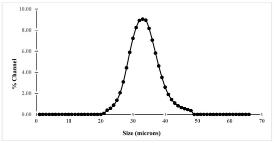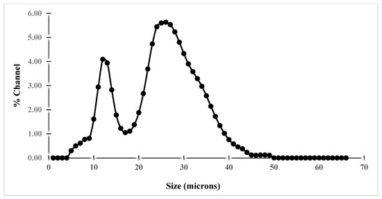 Particle size distribution measurement by laser diffraction/light scattering revealed that the shape of the particle size distribution is asymmetrical for both raw materials (Figure 11 and Figure 12). It is worth noting that the majority of particle sizes are between 12 to 14 µm and 24 to 30 µm for iron and between 30 to 38 µm for clay. From these results, it can be inferred that iron, as well as clay, have a good finesse, which could have an effect on the compact density and porosity of the elaborated membranes.