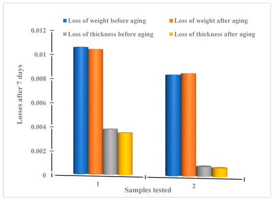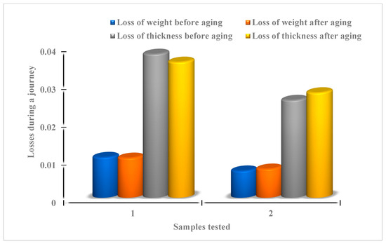 The results (Figure 13 and Figure 14) show that the variation of mass losses of ferric and clayey membranes does not exceed 0.02% ± 0.001 during a journey, with or without aging. The same variation in thickness losses was evaluated to be 0.02% ± 0.001.