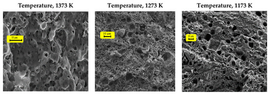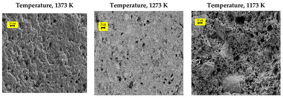 Beyond this, between 1273 and 1373 K, a phenomenon of densification appeared following the welding and the coarsening of the grains (Figure 15 and Figure 16). The heat treatment at this stage leads to a more or less irregular growth of the particles. In fact, the small grains disappear to the benefit of larger ones. A tendency towards high temperatures is associated with the progressive elimination of porosity, which essentially leads to a totally monolithic membrane (solid block).