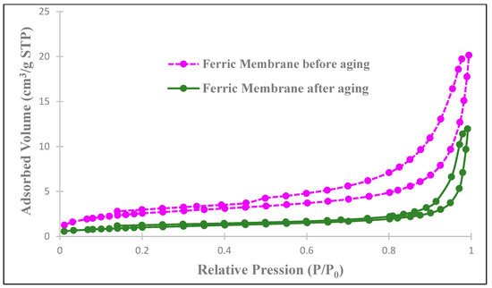 Nitrogen adsorption–desorption isotherms at 77 K of the ferric membrane, before and after sintering, show isotherms type IV. According to the IUPAC classification [26], these membranes are mesoporous. These isotherms exhibit a type H3 hysteresis (Figure 18 and Figure 19 and Table 4). After sintering, the hysteresis becomes type H4 for clay membranes (Figure 20), suggesting a slit-shaped pore [27].