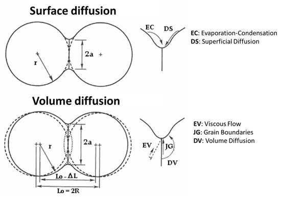 The heat treatment performed allows the generation of bonds between particles by diffusion of matter [27]. The transport of material is generally carried out by diffusion from convex regions to concave regions, leading to the development and growth of bridges between particles. Diffusion is driven by surface or volume diffusion (Figure 21). The kinetics of all the mechanisms depend on the temperature and the composition (in particular, the impurities). The densification process is present during the treatment carried out, which explains the lowering of the specific surfaces as well as the porous volumes.