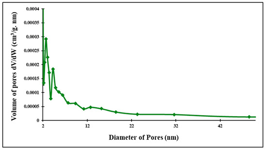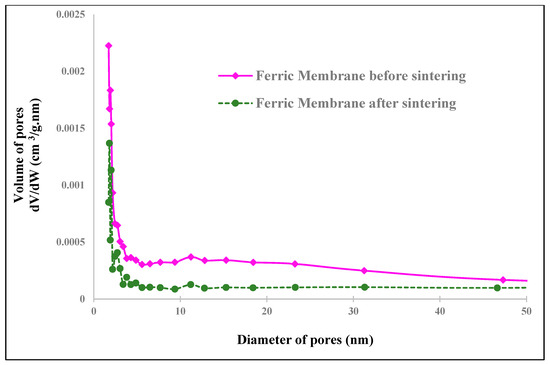 The porosity distribution determined from the N2 adsorption–desorption isotherms of samples using the BJH method (Figure 22, Figure 23 and Figure 24) also confirms the material diffusion process. The pore volumes of the two samples show a wide band varying from 5 nm to 40 nm for the ferric membrane and a less important distribution for the clay one, which confirms the data present in the previous adsorption–desorption isotherms and the predominance of mesopores.