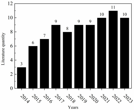 Recently, the production and metallurgical technology of nickel has reached a bottleneck. On the one hand, the scale of production in the nickel industry is constantly being compressed due to the accumulation of excessive products caused by overcapacity and the increasing public awareness of environmental protection [22,23]. On the other hand, along with increasing demand for quality nickel in the international market and the protection of high-purity nickel production technology in developed countries, it has become increasingly difficult for developing countries to create new technologies in the nickel industry [24,25]. Currently, low-quality nickel is barely used in the nickel industry, while it is expensive to produce high-purity nickel, and difficult to innovate in the production process. This is the major dilemma faced by the nickel industry in the industrial transformation period [26,27]. This paper provides a systematic review of the current nickel production process; an analysis on the literature in nickel production and metallurgical technology over the recent decade was conducted and is depicted in Figure 1. In this analysis, “Copper removal from nickel anode solution” acted as a key phrase, and it revealed a year-on-year increase in research papers retrieved through searches conducted in Web of Science and CNKI (China National Knowledge Infrastructure).