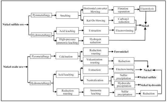 Nickel ore is characterized by low grade, complex composition, large quantity of associated ore, and high smelting difficulty. The products generated from nickel ore can vary substantially. The production process of nickel is generally quite complex. In general, nickel concentrate must first be obtained through ore dressing before it is smelted. Depending on the types of nickel ore (nickel sulfide ore or nickel oxide ore), two basic smelting methods (prometallurgy and hydrometallurgy, respectively) have been used in the production process as shown in Figure 2 [36,37].