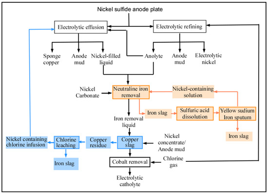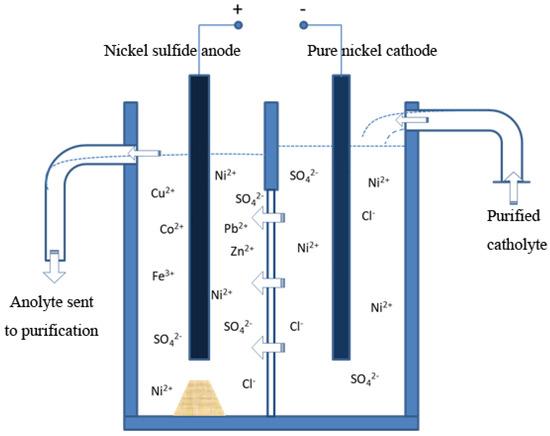 Nickel production generally involves producing a nickel sulfide anode plate from raw copper–nickel sulfide ore and obtaining metal nickel with electrolysis. This process was developed around the 1950s, and adopted for nickel production in a number of plants [38,39]. To date, this method has been used as the primary approach to nickel production in China. There are two procedures involved in this method: electrolysis of nickel and anode purge. A schematic diagram of nickel electrolysis is shown in Figure 3.
