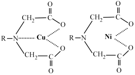 The IDA group, i.e., -N(CH2COOH)2−, is a tridentate ligand where the electrons are provided by an oxygen atom on two carboxyl groups and a nitrogen atom on the amino group. Even if the adsorbed metal ion does not form a coordinate bond with the nitrogen atom, the chemical bond formed by the two oxygen atoms can still form a stable chelating body in IDA. This feature enables a greater adsorption selectivity for IDA resin. As shown in Figure 5, there is a triple bond between copper and IDA, and a double bond between nickel and IDA. The triple bond of IDA with copper results in IDA having a stronger extraction of copper than nickel. Thus, it can be used for the selective adsorption of copper in a nickel anolyte.