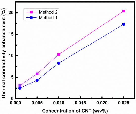 - A higher enhancement in thermal conductivity was observed in the case of Method 2 (20%) in comparison to Method 1 (17%).