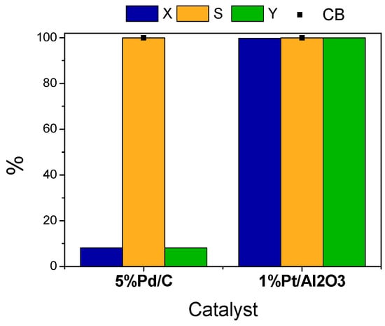 The hydrogenation of 2-hexanone was studied over two commercial catalysts, namely 5% Pd/C (Alfa Aesar) and 1 wt.% Pt/γ-Al2O3 (Alfa Aesar). As one can see from Figure 2, both catalysts exhibit a selectivity of >99% to 2-hexanol. On the other hand, 5% Pd/C (Alfa Aesar) was only poorly active with a low conversion of no more than 8%, whereas the catalyst based on 1 wt.% Pt/γ-Al2O3 achieved full conversion of 2-hexanone. The latter finding agrees with prior literature, which has demonstrated that platinum exhibits exceptional catalytic efficacy in the hydrogenation of ketones under mild operating conditions [15,16].