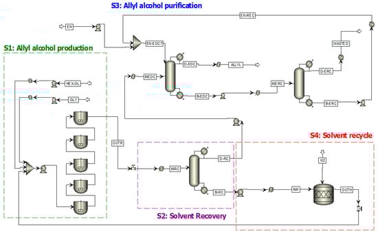 The simulation process of the allyl alcohol synthesis from glycerol with 2-hexanol as a solvent and H-donor was performed using Aspen Plus software (Aspen technology Inc., New Bedford, MA, USA). The simulation was performed for a plant capacity of 550.000 m3/a of allyl alcohol, corresponding to a glycerol molar flowrate of 960 mol/h. The process consists of four processing subsystems: allyl alcohol synthesis (S1), solvent recovery (S2), allyl alcohol purification through extractive distillation (S3) and solvent regeneration through catalytic hydrogenation (S4), which will be detailed in Section 3.4.