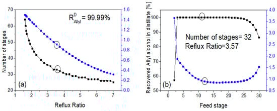Effect of the reflux ratio (a) and the number of stages (b) on the allyl alcohol recovery and 2-hexanol loss [17]. The circled stage and reflux ratio correspond to the optimal parameters.