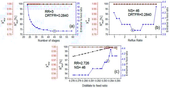 The designs of the two distillation columns for the purification of allyl alcohol (extractive distillation column—EDC; entrainer recovery column—ERC) were performed, including a sensitivity analysis aiming for purity in allyl alcohol of 99.99%. From Figure 5a, one can see that the minimum number of stages (Nm) was 23 for an entrainer-to-feed ratio (ENTFR) of 19. For the optimisation, the number of stages was fixed to twice Nm, meaning 46 stages. With this fixed number of stages, the influence of the reflux ratio (RR) on the entrainer-to-feed ratio (ENTFR) was studied (Figure 5b). The range of the reflux ratio was, therefore, varied between 1 and 4 to minimize the entrainer-to-feed ratio. From the results (Figure 5b), one can see that a plateau is reached for a reflux ratio between 2.72 and 3.5. Of course, the lowest value (2.72) is the most favourable and was thereby used for the optimisation of the distillate-to-feed ratio for a fixed reflux ratio of 2.72 and 46 stages. As seen in Figure 5c, it is possible to recover nearly the entire amount of allyl alcohol with very high purity using a distillate-to-feed ratio (DTFR) of 0.2775. However, when increasing the allyl alcohol recovers from 99.8 to 99.9%, the amount of required entrainer sharply increases. The optimized design parameters are given in Table 4.