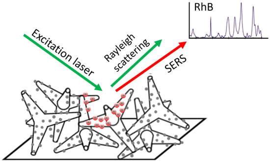 Furthermore, the integration of silver nanoparticles onto ZnO tetrapods can create a synergistic effect. The combination of the plasmonic properties of the metal nanoparticles and the semiconducting properties of ZnO could lead to a dual enhancement mechanism. The metal nanoparticles can enhance the local electromagnetic field around the tetrapods, leading to an increased Raman signal through the electromagnetic enhancement mechanism. Additionally, the charge transfer between the metal nanoparticles and the ZnO tetrapods can enhance the charge distribution and improve the charge–transfer resonance, resulting in enhanced Raman scattering through the chemical enhancement mechanism. The scheme of SERS achieved using our proposed substrate is depicted in Figure 1.