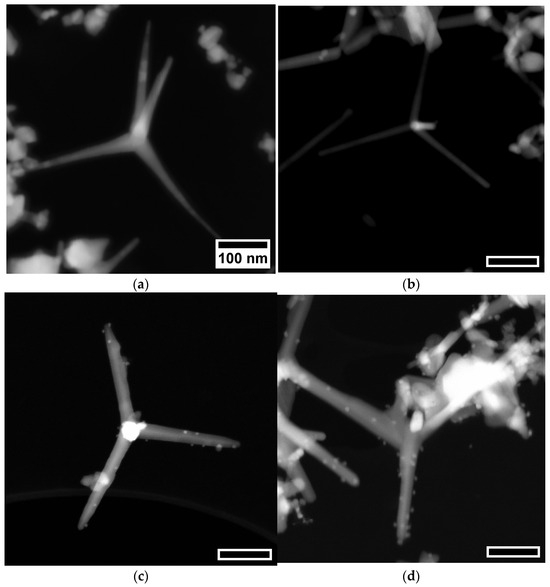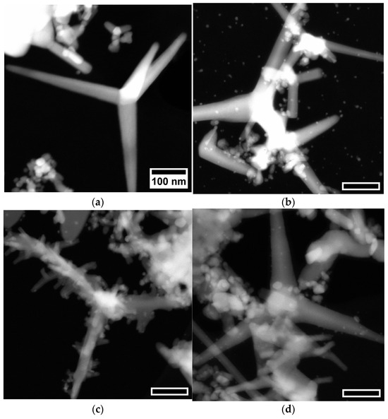 STEM images obtained in the HAADF mode of ZnO-Ag tetrapods synthesized from metallic zinc dust and silver nanoparticle targets with varying silver content: (a) 0 a%; (b) 1 a%; (c) 5 a%; (d) 10 a%.