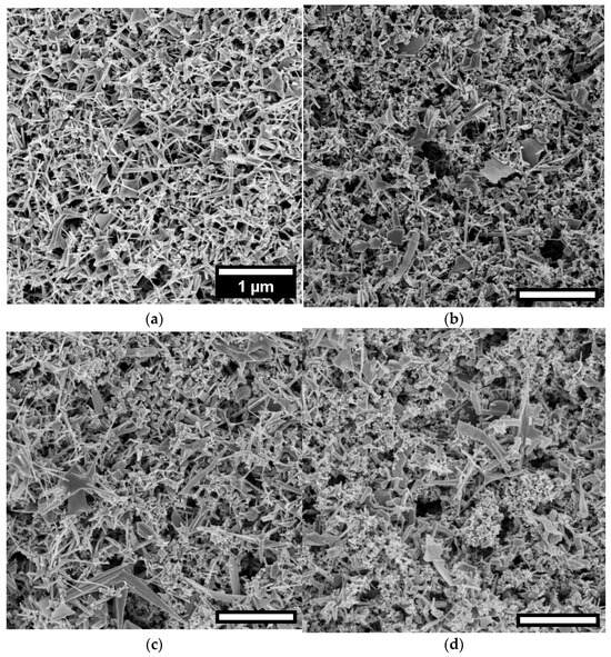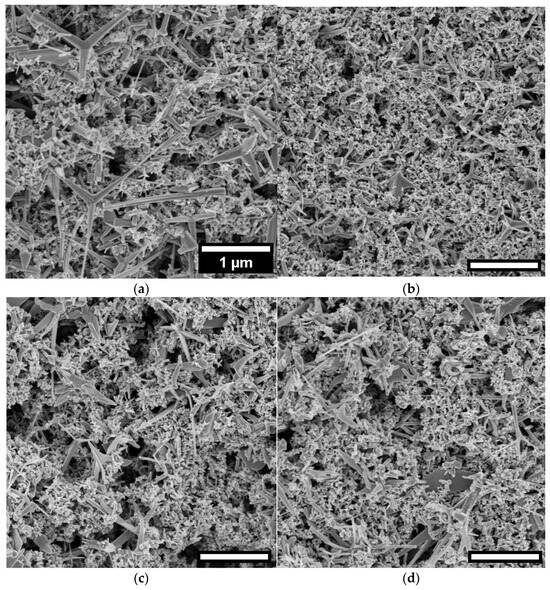 SEM images of ZnO-Ag tetrapod substrates synthesized from metallic zinc dust and silver nanoparticle targets with varying silver content: (a) 0 a%; (b) 1 a%; (c) 5 a%; (d) 10 a%.