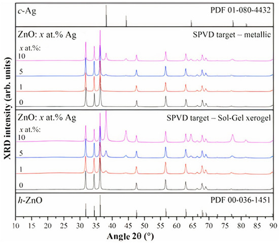 The XRD patterns for all eight synthesized ZnO-Ag tetrapods were analyzed, and diffraction pattern comparisons were made using the Match! software (version 3.14) PDF-4+ database. The obtained results provided the crystallographic structures of the synthesized tetrapods, as depicted in Figure 6. The diffraction patterns revealed distinct peaks corresponding to cubic Ag and hexagonal ZnO phases. The presence of these characteristic peaks indicates the successful incorporation of silver nanoparticles into the ZnO tetrapod structures. The peaks associated with cubic Ag were identified at the same angles as those provided in the database, and their intensities were examined. The relative intensity of these peaks was found to correlate with the Ag content in the samples, as determined using EDX measurements. Specifically, the diffraction patterns demonstrated the highest intensity of cubic Ag peaks in the case of the ZnO tetrapods synthesized from silver ion-containing zinc xerogel, especially for the ZnXAg10 sample, aligning with the EDX data, which revealed the highest concentration of silver in this sample.