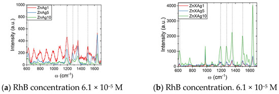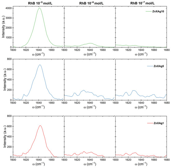 For the comparison of Raman enhancement between the substrates, the series of ZnO-Ag tetrapods obtained from silver ions containing zinc xerogel was chosen, and the most intense Raman shift at 1644 cm−1 was selected. The graphs of three different concentrations of RhB (6.1 × 10−5, 6.1 × 10−6, and 6.1 × 10−7) are depicted in Figure 8, providing insights into the sensitivity of the SERS substrates.