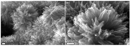 The “needles” of the urchin-like particles exhibit a fibrous heterogeneous structure with a diameter of (30–50) nm, leading to a decreased degree of material crystallization and higher amorphization. EDX spectra in Figure S4e confirm the composition of the material, which consists primarily of iron and oxygen, with the presence of sulfur from SO42−. The element ratios obtained from EDX spectra are 2.86 for O/Fe and 4.42 for Fe/S. The oxygen content in the samples exceeds the expected 2:1 value for FeOOH, as it is likely that a compound with a structure of schwertmannite—a sulfate-containing mineral—was obtained, as the synthesis conditions were the same as reported earlier [74]. The obtained XRD pattern (Figure S3) shows that the closest match for this material is indeed schwertmannite (PDF 47-1775) [81], though the obtained powder is X-ray amorphous, complicating the exact determination of the phase.