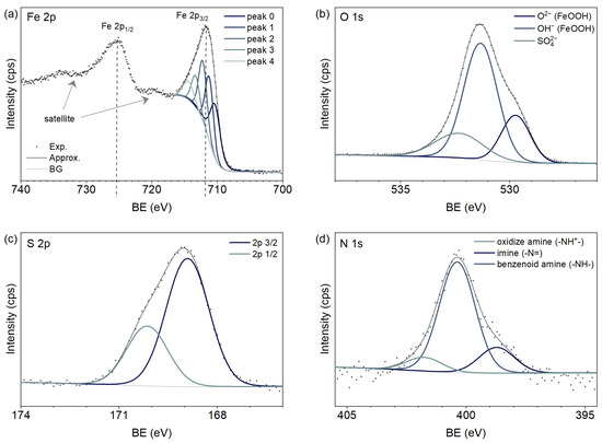 There is a Fe 2p3/2 peak with Gupta-Sen multiplet components in the Fe 2p XPS spectrum in Figure 2a [82]. Their intensities and the binding energy (BE) of the low-energy component (710.4 eV) align with the Fe 2p spectra of FeOOH [83,84,85]. The O 1s peak (Figure 2b) is approximated by three components, with two attributed to FeOOH [83,86,87] and one high-energy component to SO42− species [81,82]. The S 2p level spectrum (Figure 2c) agrees with this, exhibiting only one chemical component attributed to highly oxidized sulfur (i.e., SO4) [88,89]. The N 1s spectrum from PANI reveals an imine nitrogen at the 398.7 eV peak, a protonated nitrogen at 400.4 eV (benzenoid amine (-NH-)), and an oxidized amine at 400.8 eV [90,91,92]. The doping level, determined by the ratio of N+ to the total nitrogen content, was approximately 13% [93], and the total nitrogen content in the sample was ca. 2.5 at %.