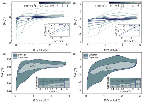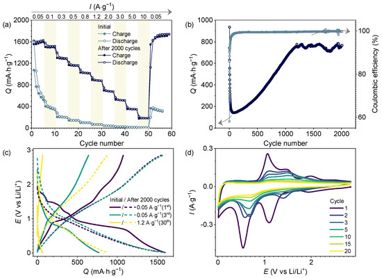 At a scan rate of 1 mV∙s−1 (Figure 4c,d), 57% and 60% of the total charge are stored through diffusion-controlled processes after 20 and 2000 cycles, respectively. As the scan rate increases, charge storage via capacitive processes rises to 68% and 73%, respectively. Therefore, at low scan rates, Li+ ion diffusion limits the overall electrochemical reactions, while pseudocapacitance becomes the dominant charge/discharge mechanism with increasing scan rates (insets of Figure 4c,d). The high capacitive contribution is attributed to the large surface area of nanosized particles and their high electronic interconnectivity [26].