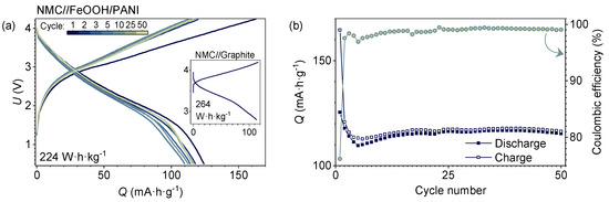 NMC532//FeOOH/PANI full cell performance within the (0.5–4.20) V range at C/2 referred to the NMC532 cathode mass (1 C = 140 mA∙g−1) in terms of (a) selected voltage profiles, inset: charge–discharge curve of the NMC532//Graphite full cell at a C/2 rate; (b) trends of specific capacity and coulombic efficiency. Electrolyte: 1 M LiPF6 in EC/DEC (1:1, v/v).