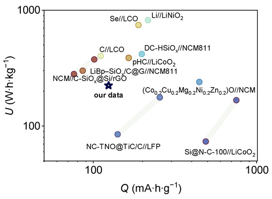 A comparison of the full cell energy density with the literature data for various anode systems (Figure 6) shows that the characteristics of the full cell are comparable with other oxide-based conversion anodes (e.g., (Co0.2Cu0.2Mg0.2Ni0.2Zn0.2)O [117]) on the one hand, and are at the lower end of the silicon and carbon-based anode series on the other hand. However, the complicated composition and specific reagents make the synthesis of such compounds labor-intensive, which would ultimately affect the economic attractiveness of the product.