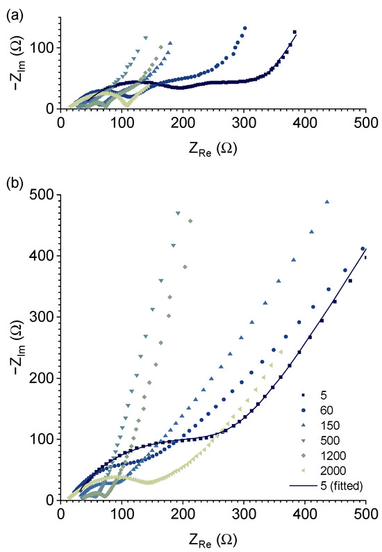 The impedance spectra of the FeOOH electrode recorded at the charged and discharged states of the half-cells after 5, 60, 150, 500, 1200, and 2000 discharge/charge cycles are presented in Figure 6. Nyquist plots show two distinct semicircles in the discharged state (Figure 7a) and one semicircle in he charged state (Figure 7b). In the discharged, state the first semicircle can be attributed to the passivation film on the surface, or SEI, and the second semicircle refers to the charge transfer resistance of the Li+ absorption/desorption process at the interface [127,128]. In the charged state, a single semicircle is attributed solely to the SEI, and the charge transfer resistance is negligible. The significant decrease in charge transfer resistance is similar to the case of the FeOOH/graphite composite we reported previously [74].