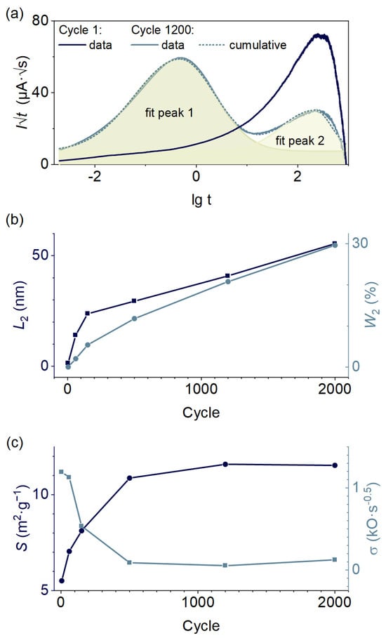 The parameters from the fitting of the two semicircles using a series of parallel R-CPE elements for the discharge state (Table 3) show that there is a non-monotonic change in the Q1 (SEI capacitance). Q1 increases up to the 1200th cycle, followed by a decrease to the 2000th. In addition to the electrochemical milling, the SEI dielectric constant affects Q1, the nature of which may change during the discharge since catalytic reduction of electrolyte components with the formation of a redox-active gel-like film is possible on iron particles [42,103]. The CPE exponent a1 lies in the 0.75–0.88 range, showing that CPE1 consistently exhibits capacitor-like behavior. This is also confirmed by the SEI capacitance increase in comparison to the charged state of the electrode. The SEI resistance R1 behaves similarly to that of the charged state, the only difference being that its minimum is at the 150th cycle, followed by a gradual increase.
