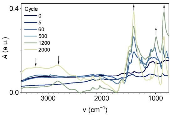 To elucidate the mechanism of the FeOOH/PANI-base electrode capacity increases during cycling, we obtained impedance spectra at 5, 60, 150, 500, 1200, and 2000 cycles and characterized electrodes after these cycles by ATR-FTIR, XPS, SEM/EDX methods. Also, diffusion coefficients were calculated from PITT measurements with the Cottrell approach according to [126] at 2.85, 2.5, 2.0, 1.5, 1.0, 0.5, and 0.01 V for the 5th, 60th, 150th, 500th, 1200th, and 2000th cycles.