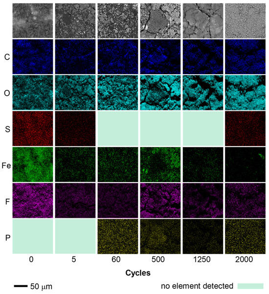 To investigate the evolution of materials throughout their cycle life, electrochemical impedance spectra of representative cells and data from the potentiostatic intermittent titration technique were collected at potential levels of 2.85, 2.5, 2.0, 1.5, 1.0, 0.5, and 0.01 V after 5, 60, 150, 500, 1200, and 2000 cycles. Following this, the cells were disassembled in an argon-filled glove box. Cathodes were thoroughly rinsed with diethyl carbonate and subsequently dried for 24 h. SEM/EDX, ATR-FTIR, and XPS analyses were performed on the samples after 5, 60, 150, 500, 1200, and 2000 recharging cycles.
