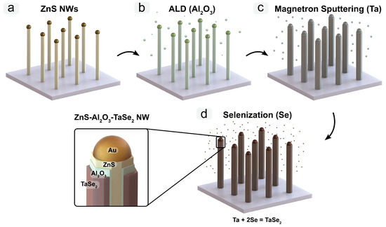 The fabrication of ZnS/Al2O3/TaSe2 core/shell NWs was accomplished using a four-step method (see Figure 1):