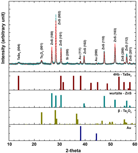 Rietveld refinement (solid line) of the X-ray diffraction pattern (open circles) for selenized ZnS/Al2O3/Ta NWs on an oxidized Si/SiO2 substrate. The corresponding Bragg indexes for each crystalline phase have been identified and marked, as well as XRD patterns for 4Hb-TaSe2 [11], wurtzite ZnS phase [37], -Ta2O5 [40] and Au [44].