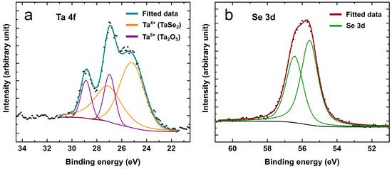 XPS analysis further validated the chemical states within the shell of the heterostructured NWs, as depicted in Figure 3 (survey scan presented in Figure S3). High-resolution spectra of the Ta 4f and Se 3d peaks were acquired and calibrated relative to the adventitious C 1s peak at 284.8 eV. No other elements, except the constituents of the SiO2 substrate, were detected due to the tantalum selenide coating and carbon layer. A Ta 4f scan revealed a peak consisting of two doublets. To mitigate the error during the peak fitting, a spin-orbit splitting eV was fixed between the Ta 4 and 4 components in each doublet and the area ratio was held at 4:3. The first doublet with a Ta 4 peak at 25.2 eV corresponded well to the Ta valence state in the TaSe2 compound [27,45]. The other Ta 4 peak, shifted to higher energies at 27.0 eV, was attributed to the Ta chemical state with valence [27,42], as in the Ta2O5 compound. The presence of the -Ta2O5 phase was also confirmed by the XRD measurements. TaSe2 is known to be susceptible to oxidation in ambient conditions, especially in its nanostructured form, thus the material should be handled and stored in an oxygen-free environment to increase its stability. The Se 3 peak was located at 55.6 eV (spin-orbit splitting eV), matching tantalum selenide [45].