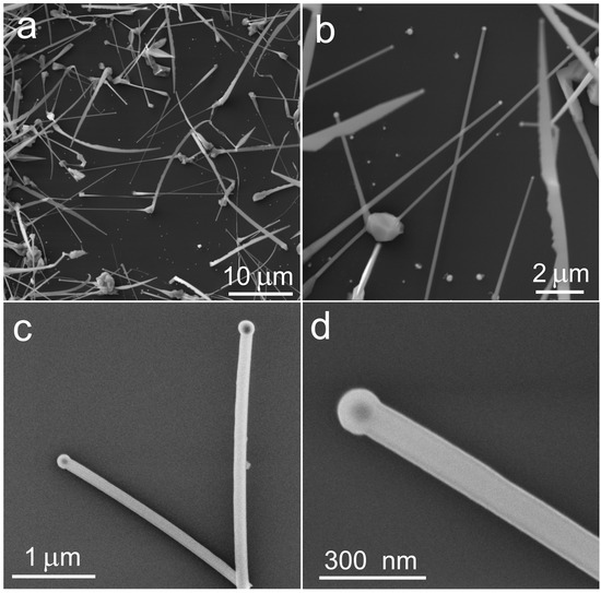 To determine the geometry and morphology of the core/shell NWs, SEM was used (Figure 4). According to the SEM images, NWs have a straight shape and a length in the order of 10 microns. The preservation of the straight shape of NWs is important because the shape and integrity of NWs can be compromised at high temperatures and in an aggressive corrosive atmosphere. As mentioned before, a thin layer of Al2O3 was used to cover and protect NWs during the selenization procedure, similar to in our previous work [26].