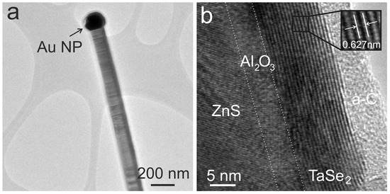 TEM microscopy was used to investigate the morphology and inner structure of core/shell NWs in detail. Typical images of two core/shell NW are presented in Figure 5. At the ends of every NW, Au nanoparticles can be seen, which is typical for the VLS growth mechanism. Au NPs appear as bright dots in the SEM images (Figure 4b) and as black dots in the TEM images (Figure 5a,b). Upon the selenization of the Ta shell, a TMD layer of TaSe2 can be seen around NWs, which appears as black parallel lines (Figure 5b). The shell thickness varies from ∼10 layers to ∼20, with interlayer distance measured around 0.627 nm, which corresponds very well to the 0.627 nm interlayer distance in the 1T-TaSe2 [12], 0.635 nm in the 2H-TaSe2 [13], and 0.6287 in the 4Hb-TaSe2 [11] materials. A layer of non-crystalline carbon was discovered atop the TaSe2 surface, potentially formed through catalysis from carbon present in the atmosphere. More TEM images of selenized ZnS/Al2O3/Ta NWs can be found in Figure S3 in the Supplementary Data file. It was impossible to achieve the atomic resolution of the Al2O3 interlayer, which covers ZnS NWs; however, the thickness of the amorphous spacing between ZnS and TaSe2 corresponds well to the expected Al2O3 thickness.
