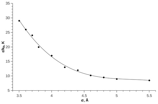 Figure 3 shows the dependences of ε on σ, found from the saturated vapor pressure. It can be seen from the figure that as σ increases, the required value of the parameter ε decreases. It should be noted that the CH groups of decalin are surrounded by CH2 groups of the rings. Thus, CH groups make not the main, but a corrective contribution to intermolecular interaction. The influence of this factor on the parameter values can be observed on the CH3 (ε/kB = 98 K, σ = 3.75 Å), CH2 (ε/kB = 46 K, σ = 3.95 Å), CH (ε/kB = 10 K, σ = 4.68 Å) C (ε/kB = 0.5 K, σ = 6.4 Å) alkane groups in the TraPPE force field [6,7]. The CH3 groups in alkanes are terminal and make the main contribution to the interaction. Such groups are characterized by a small size (parameter σ) and a large depth of the potential well (parameter ε). Also, a small change in these parameters will dramatically change the simulation result. In the indicated sequence of groups from CH3 to C, hydrogen atoms are gradually replaced by hydrocarbon radicals. Thus, the interaction site under study is covered by other sites. This fact leads to the interaction distance increases (parameter σ). However, the strength of interaction (parameter ε) is significantly reduced. Thus, these sites make a corrective contribution to the interaction for a better description of the thermodynamic properties.
