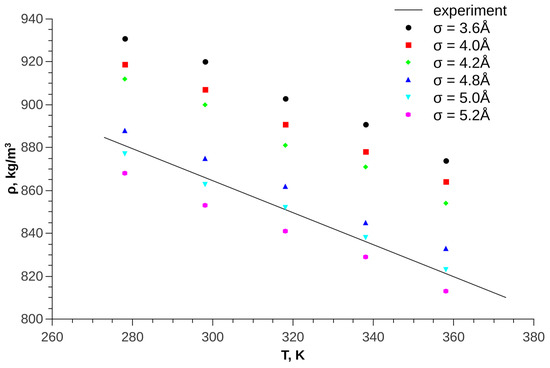 Trans-decalin densities as a function of temperature at atmospheric pressure for different values of the parameter σ, the value of ε/kB was found in Figure 2. Symbols—simulation results, line—experimental data [38].