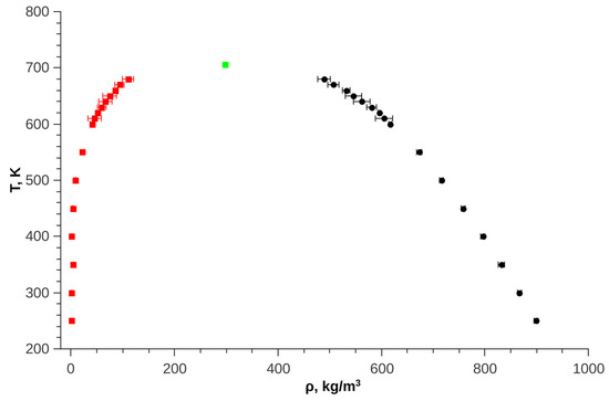 The obtained critical point parameter values (Tc = 706 K, ρc = 298 kg/m3, pc = 34.15 bar) are consistent with the values used in the equations of state [40] (Tc = 703.6 K, ρc = 288 kg/m3, pc = 32.0 bar). Currently, the direct use of molecular dynamics and Monte Carlo methods in chemical engineering calculations is limited by computational power. However, the use of these methods is justified when adjusting the parameters of “classical” models of phase equilibrium. In case of an insufficient amount of experimental data, it is possible to adjust the parameters using existing experimental data and supplement them with the results of a numerical experiment.