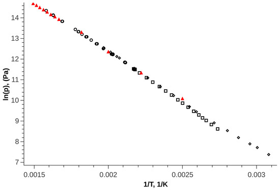 Saturated vapor pressure of trans-decalin, black symbols—experimental data, circles—[35], squares—[37], diamonds—[36], red triangles—simulation results.