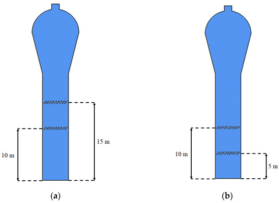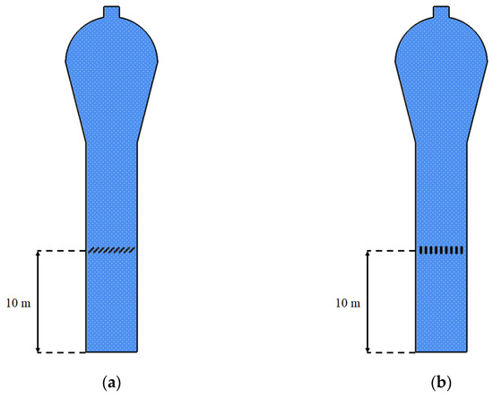 To explore the effect of stage number and its configuration on the segregation of solid particles within the reactor, a single baffle stage consisting of 9 baffles set at a 45-degree angle was employed. Single and double stages were utilized, and two types of stage arrangements were encompassed. The first arrangement, denoted as the “above arrangement” and displayed in Figure 3a, featured the insertion of an additional baffle stage above the base stage, positioned at a height of 15 m from the reactor’s bottom. The second arrangement, termed the “below arrangement” and depicted in Figure 3b, involved the insertion of an additional baffle stage below the base stage, situated at a height of 5 m from the reactor’s bottom.
