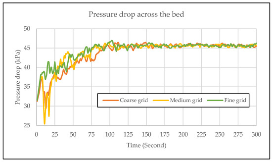 In the simulation study, ensuring the accuracy of the results was a primary concern. Therefore, grid independence tests and Courant number comparisons were investigated before adjusting the model and validating its results in this study. The investigation considered both the grid number and the Courant number to determine the most suitable grid configuration for the simulation. The system’s pressure drop was computed and compared across three different grid numbers. Figure 4 depicts the transient pressure drop for each grid size scenario. The findings demonstrated that the pressure drop values were closely aligned across all grid sizes and achieved a quasi-steady state after 150 s.