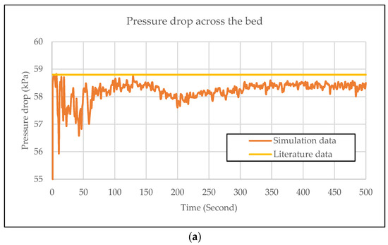 To ascertain the accuracy of the model, a comparison was made between the pressure drop and bed height values obtained in this study and the literature data sourced from Akbari et al. [16,17,18], which pertained to actual industrial operation records. According to the literature, the reactor’s pressure drop was approximately 58.8 kPa, while the final bed height was 20 m. Figure 5a illustrates the juxtaposition of pressure drop values derived from the model and those from the literature. The acquired pressure drop closely approximated 58.4 kPa, exhibiting only a 0.70% deviation from the literature data. Furthermore, as depicted in Figure 5b, the determined bed height aligned well with the literature data.