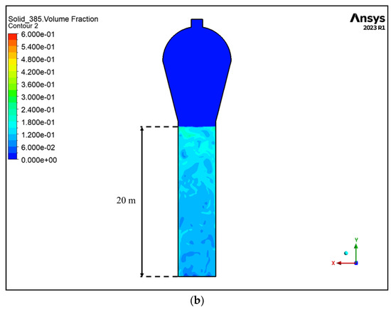 Because the model is a solid–fluid multiphase model, it needs to account for forces acting on the particles, such as drag force and gravity force, whether in solid–gas or solid–liquid interactions, as investigated by Brazhenko et al. [23]. Furthermore, drag force remains a key consideration in the gas–solid–liquid model investigated by Zhan et al. [24], as well as in the CSTR model by Kou et al. [25]. From Figure 5b, the increased diameter beyond the reaction zone resulted in a decrease in gas velocity. Consequently, this reduction in gas velocity caused a decrease in the drag force acting upon the object, prompting its upward movement. Eventually, as the drag force diminished to a value lower than the gravity force, the particles fell from the top of the bed.