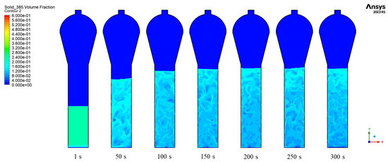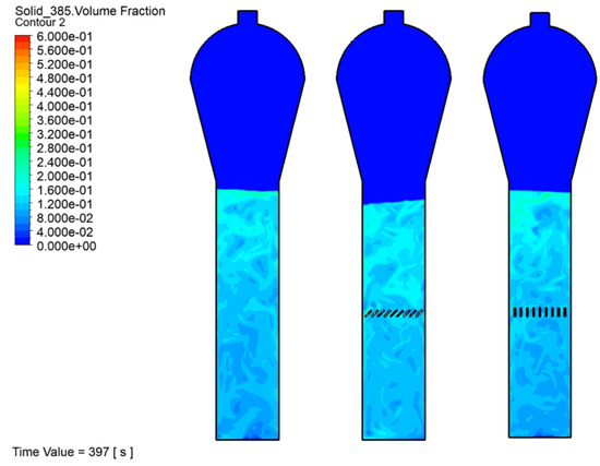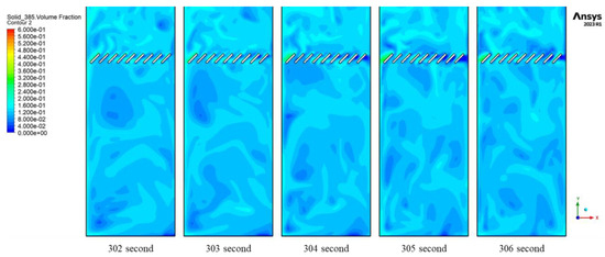 To examine the segregation behavior, the simulation results were assessed after 200 s. Figure 6 displays the solid volume fraction of the small solid particles at intervals of 1, 50, 100, 150, 200, 250, and 300 s, respectively. It was observed from the figure that the small solid particles tended to aggregate at the upper section of the bed. When segregation occurred within the system, the mixing of solid particles in the fluidized bed reactor was diminished. This reduction in mixing led to a decrease in heat transfer between gas–solid particles and solid–solid particles, potentially resulting in a hot spot within the system. Additionally, there was a possibility of small solid particles escaping from the fluidized bed reactor. During the combustion process, the fine solid particles that escaped from the power plant boiler underwent combustion and incurred damage around the cyclone separator [1]. To mitigate segregation behavior within the fluidized bed system, baffles with varying angles were introduced into the fluidized bed reactor.