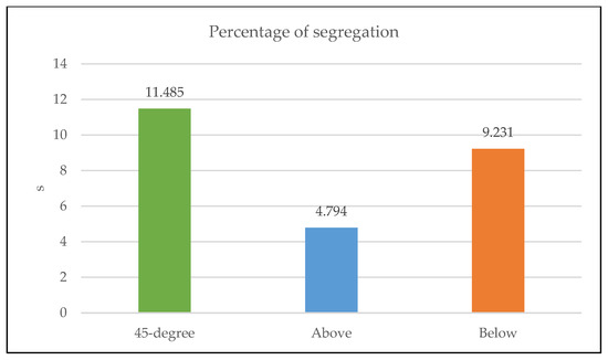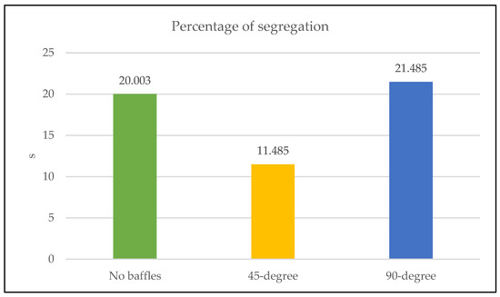The segregation behavior in the system was confirmed to be reducible by the additional baffle stage through the percentage of segregation chart in Figure 18. It was observed that the relative segregation rate of the single stage was higher than that of the two-stage baffles with any arrangement. Furthermore, the lowest relative segregation rate was observed in the above arrangement, followed by the below arrangements. To facilitate clear observation, the 45-degree baffle case was considered a single-stage baffle and compared to the above case, which was a double-stage baffle.